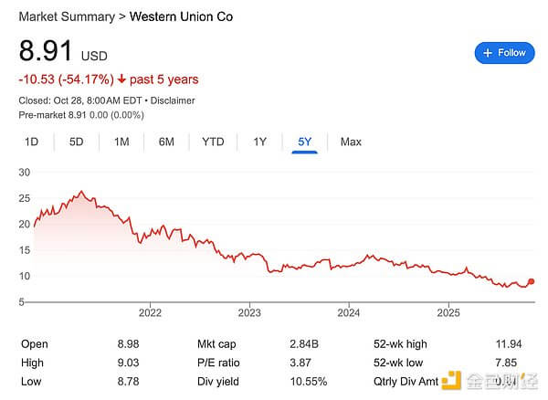 鉴于西联汇款的股价在过去五年里下跌了超过50%,市场更有可能认为西联汇款将成为稳定币和原生加密货币支付轨道在竞争中留下的牺牲品之一。